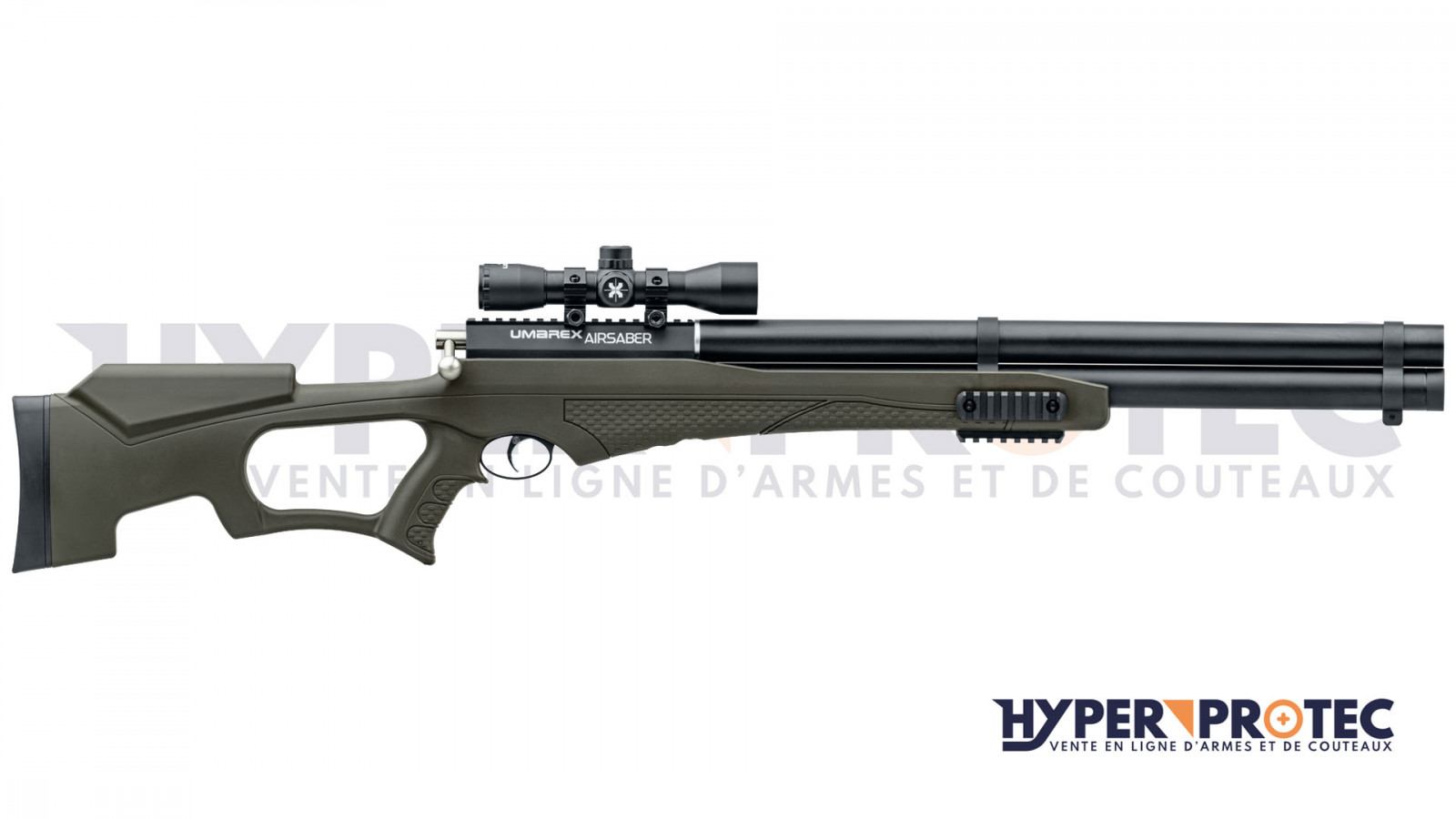 La carabine à flèche Umarex AirSaber est une carabine PCP (air pré-comprimé) qui développe une puissance de 150 joules. Carabine PCP avec un réservoir de réserve d'air de 200 bars à remplir avec trois solutions au choix soit une pompe à main PCP, soit un compresseur PCP ou une bouteille de plongée avec son module.