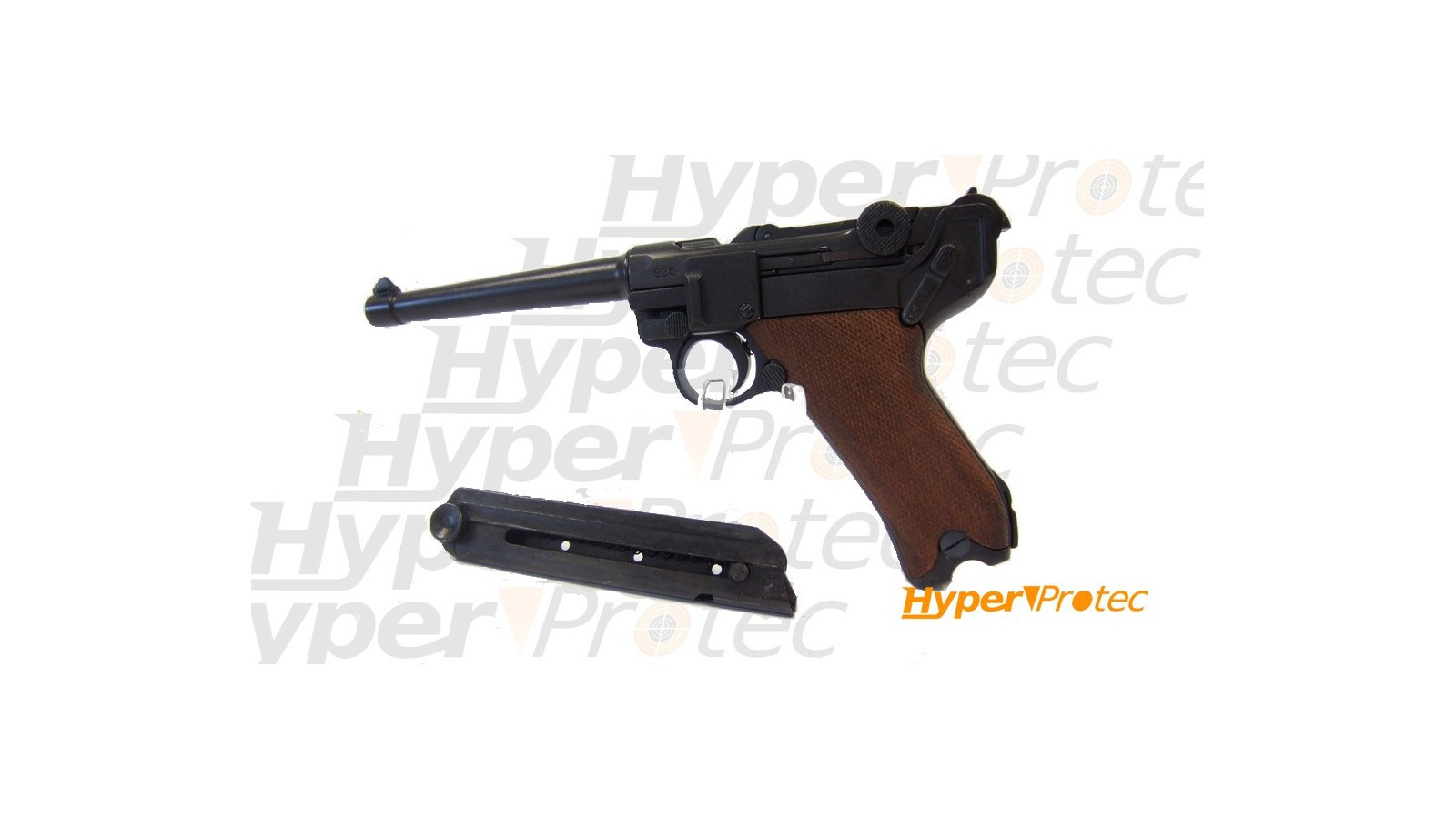 Réplique du pistolet Luger P08 version à canon long, comme ceux utilisé par la marine. La réplique est en métal à l'échelle, avec un mécanisme interne fonctionnel et des bruitage réaliste, seule différence le canon est bouché et vous ne pourrez pas tirer avec. Ici avec la version à plaquettes synthétiques imitation bois.