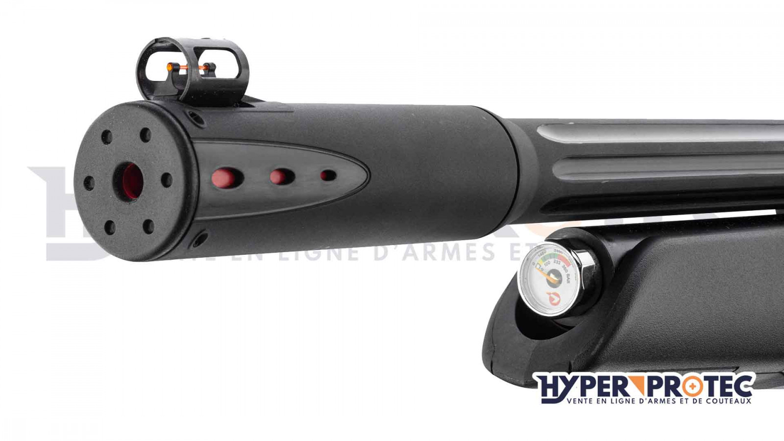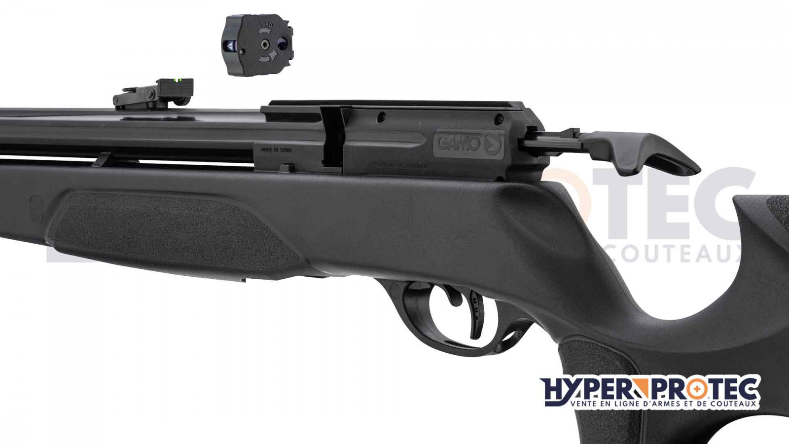 Pour la question du canon, il n'est pas fileté, donc impossible de rajouter un silencieux. Mais Gamo a pensé à tout, la marque espagnole, compose avec sa technologie Whisper Fusion, qui propose un dispositif à chicane qui repousse les gaz vers l'arrière du canon. Système breveté qui permet une réduction de bruit vraiment impressionnante, équivalent aux meilleurs silencieux 22 LR.