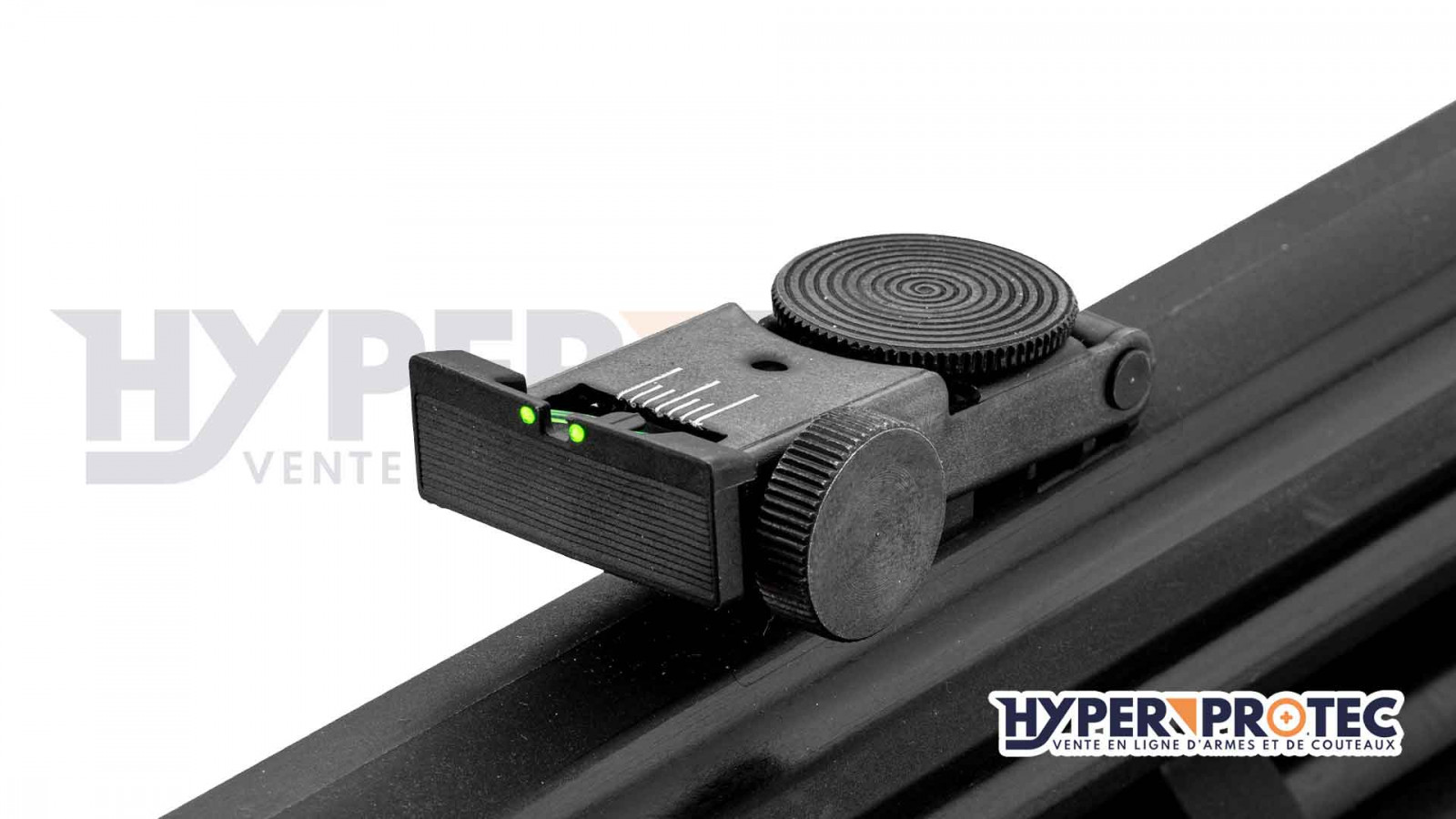 On remarque tout de suite le profil de la crosse synthétique, qui offre une excellente prise en main, avec une position de tir entre une crosse thumbole et une poignée pistolet. L'appuie joue monte relativement haut pour permettre d'être aligné avec la prise de visée ouverte composée d'un cran de mire réglable et d'un guidon tunnel, les deux en fibre optique.