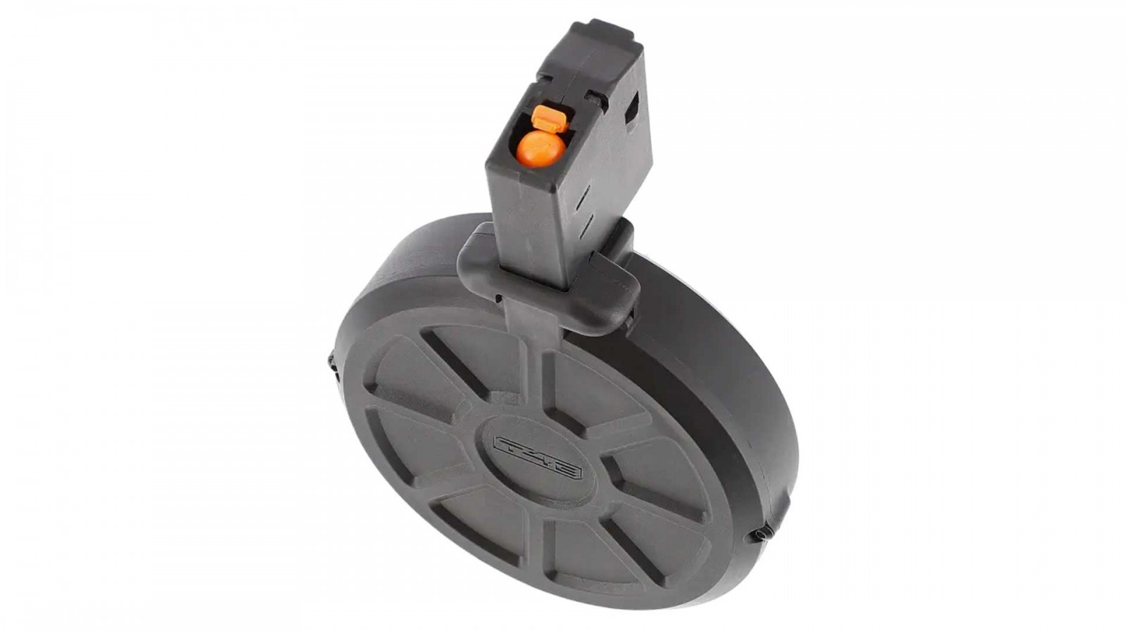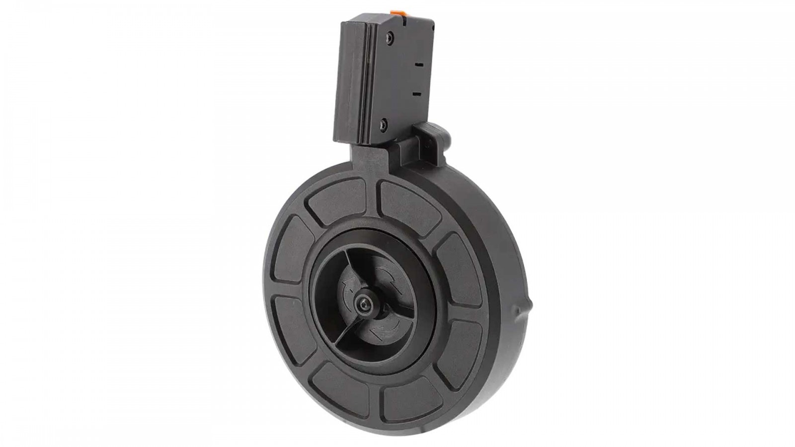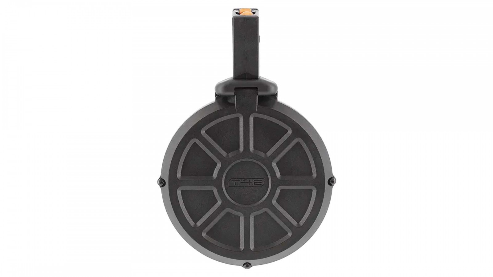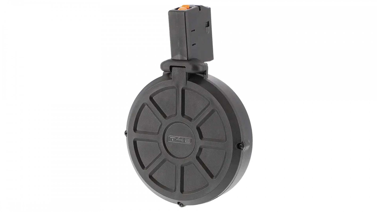 Chargeur à tambour 40 coups Drum Magazine (chargeur camembert) pour carabine tactique T4E TC 68, conçu pour accueillir 40 munitions calibre .68. Ce chargeur haute capacité permet l'utilisation de toutes les munitions sphériques. Grâce à son système de précontrainte manuelle du ressort, ce chargeur garantit une alimentation fluide et constante des projectiles.