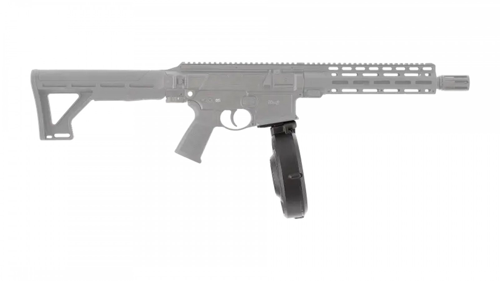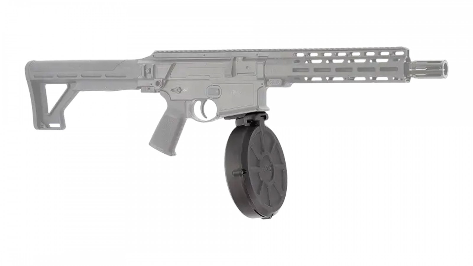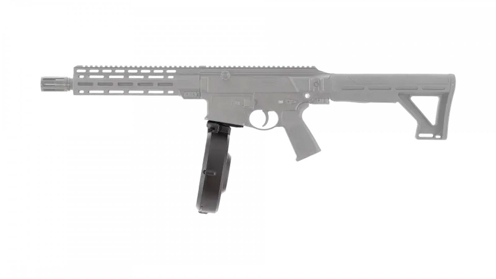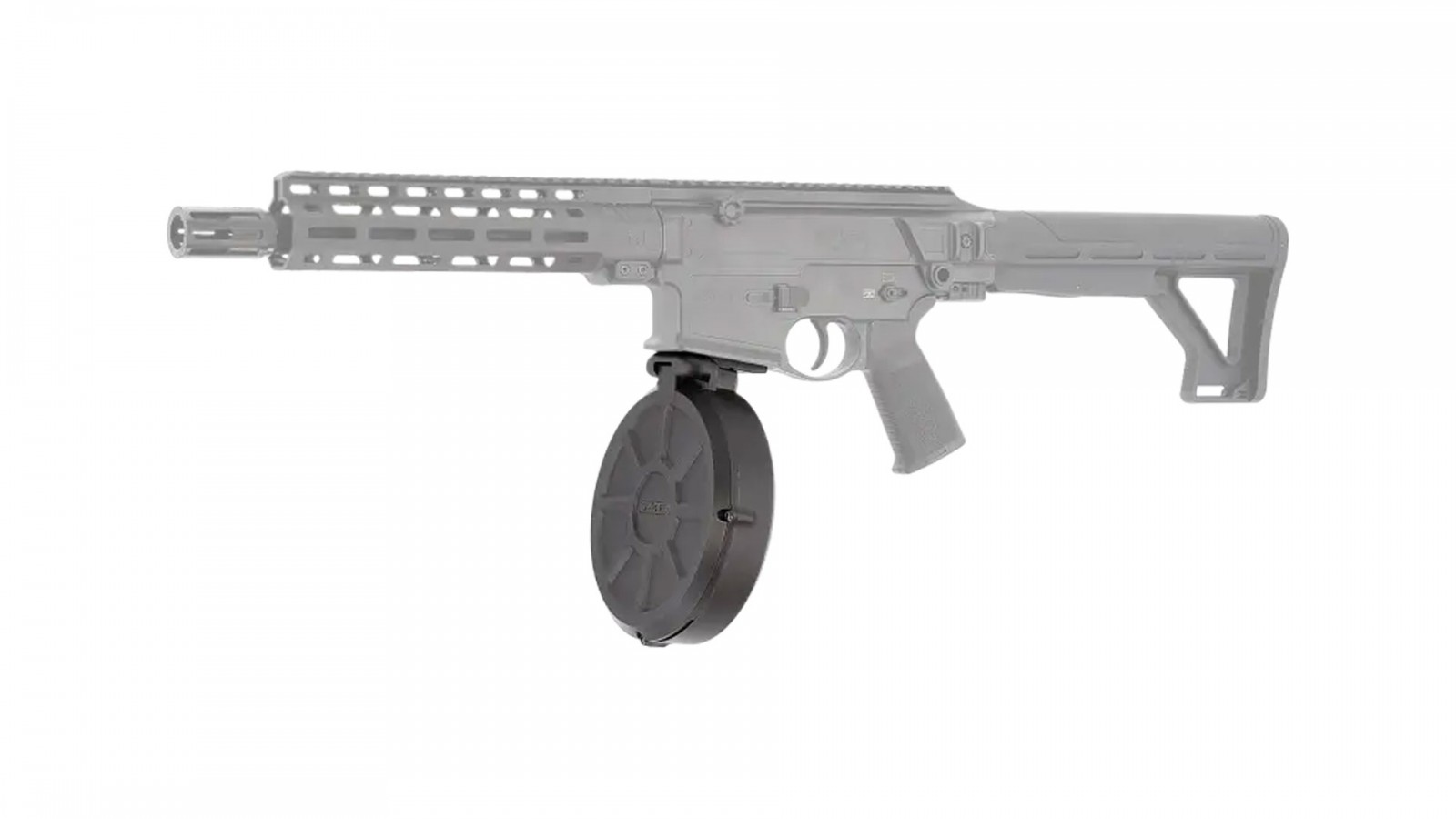 Chargeur à tambour 40 coups Drum Magazine (chargeur camembert) pour carabine tactique T4E TC 68, conçu pour accueillir 40 munitions calibre .68. Ce chargeur haute capacité permet l'utilisation de toutes les munitions sphériques. Grâce à son système de précontrainte manuelle du ressort, ce chargeur garantit une alimentation fluide et constante des projectiles.