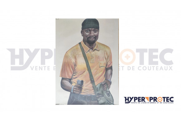 Poster couleur d'un individu en position de 89x64 cm. La cible peut être agrémentée d'overlay ce sont des images qu'on ajoute au poster cible pour le rendre soit une target cible à détruire ou une cible potentiellement non agressive donc à ne pas tirer dessus. Agrémenter un parcours de tir de différentes cibles humaines et déterminer rapidement lors du déplacement si elles sont amies ou ennemis !