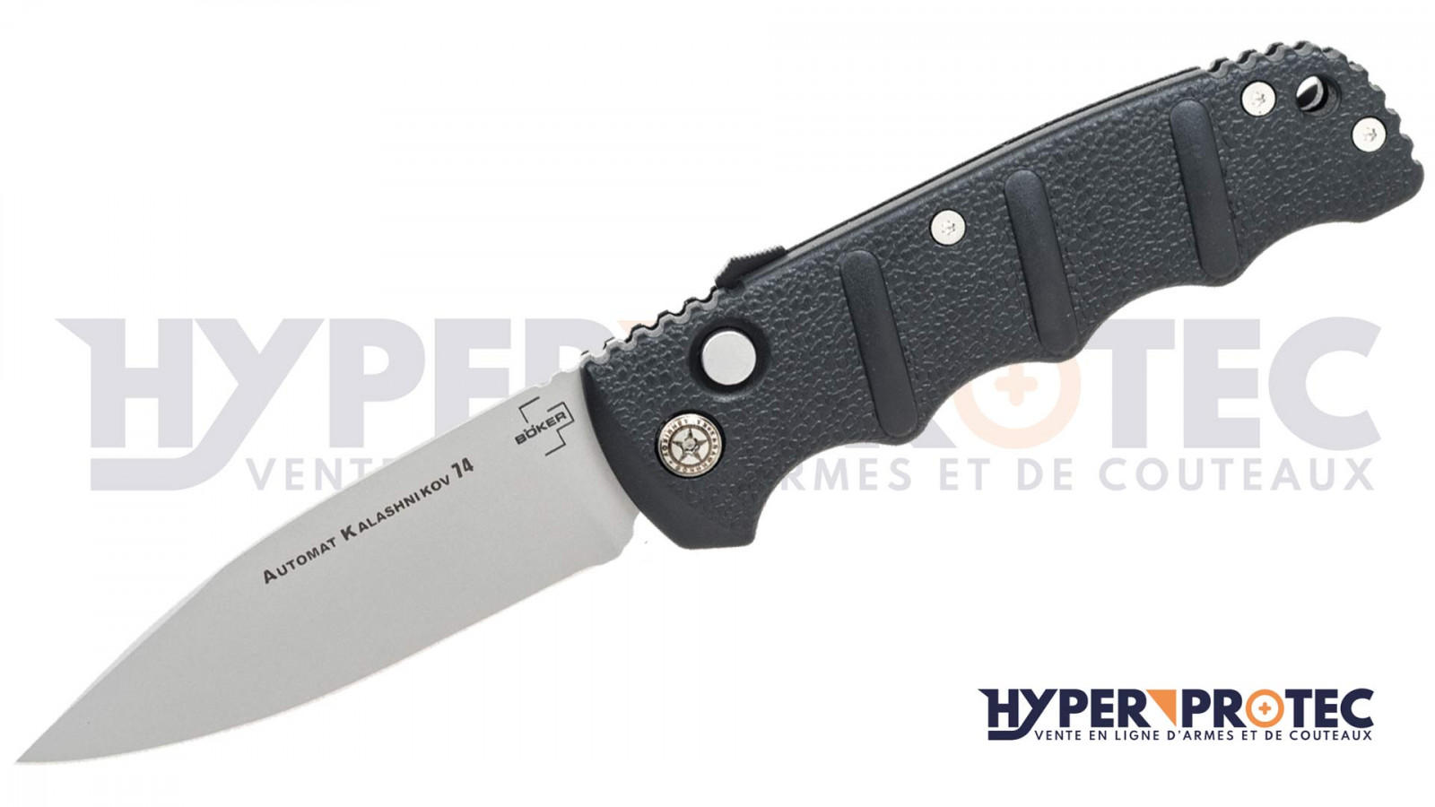 Ici le modèle Böker Plus AKS-74 D2 en version manche noir de 11,5 cm, lame Drop-Point de 8,5 cm grise avec tranchant lisse.