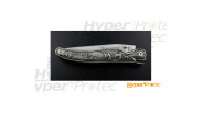Beau couteau Laguiole modèle Genes David. Avec manche en aluminium décor chasse en relief bien détaillé. représente un archer qui chasse des cerfs dans une forêt. Ce couteau pliant dispose d'une lame en acier inoxydable 12C27, un ressort guilloché avec une forme d'abeille caractéristique de la marque Laguiole - système de fermeture slip-joint