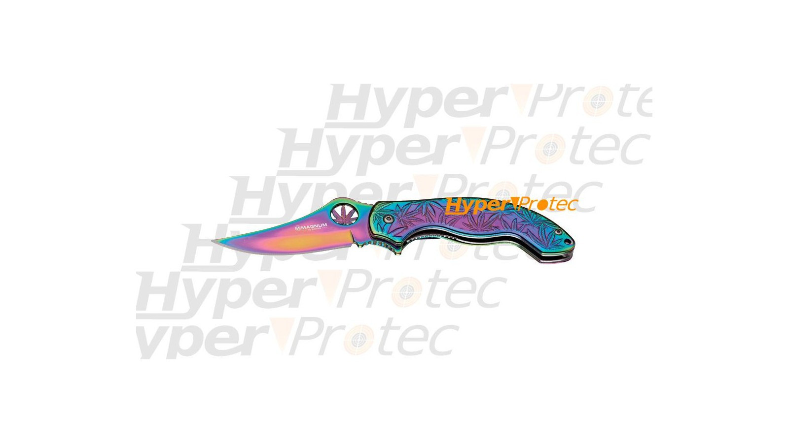 La marque Magnum propose un couteau inédit et maniable. Le couteau possède un revêtement spécial aux couleurs de l'arc en ciel. Ce couteau est conçu plus spécialement pour les amateurs de botanique et pour les grands amis de la culture de chanvre on peut reconnaitre une décoration avec des feuilles de cannabis.