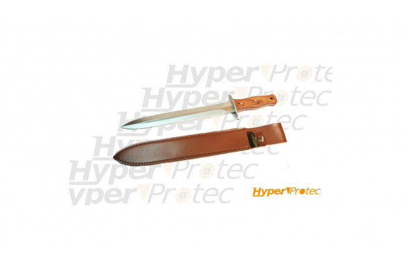 Dague de chasse, couteau à servir le gibier après battue, grande lame de 28cm évidée avec un creux pour l'écoulement du sang. Manche en bois de pacca, vendu avec un étui en cuir pour transport facile. Sur le manche un motif de sanglier est gravé dans le métal en relief.