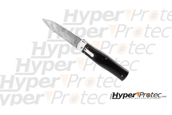 Un couteau automatique Predator Mikov avec son manche en corne de buffle et sa lame en acier Damas 128 couches. Livré avec son étui en cuir noir pour un port ceinture.