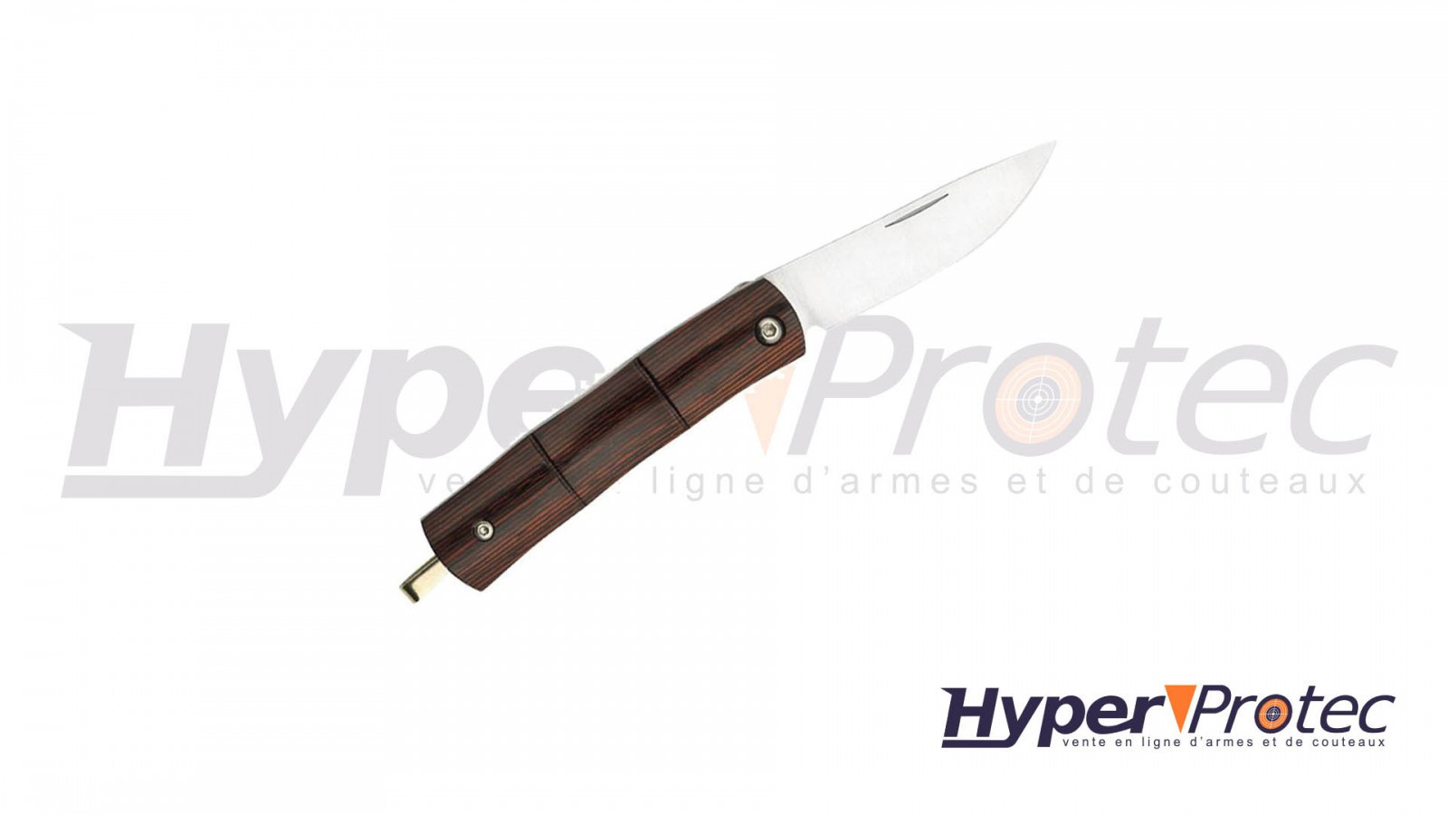 Un petit couteau de la marque prestige Mcusta, avec une lame en acier VG10, un manche d'un côté pacca rouge et de l'autre clip ceinture martelé et ouvragé.
