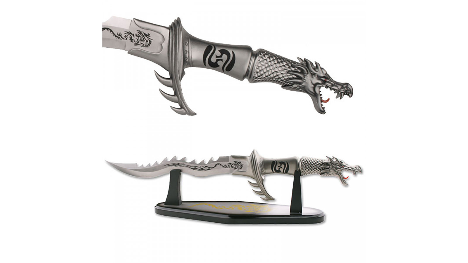 Dague représentant un animal fantastique particulièrement craint et puissant présent dans de nombreux univers fantastiques de films, jeu de rôle... Dague avec belles finitions et manche très détail pour le décor de la poignée suivi du cou et de la tête du dragon cracheur de flammes.