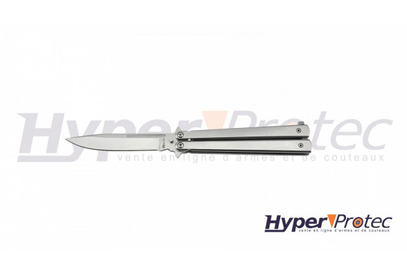 Ce Balisong est très classique avec un manche rectangulaire en métal avec une finition silver. Couteau papillon métal, tient correctement dans la main et permet de le manipuler avec une seule main et de l'ouvrir ou si vous avez un peu d'entraînement, de faire des tricks.