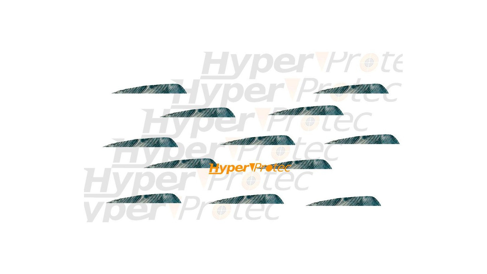 Lot de 12 plumes naturelles paraboliques rayées bleue pour flèches d'arc. Convient pour toute flèche, longueur 127 mm. A voir chez votre archerie Hyperprotec