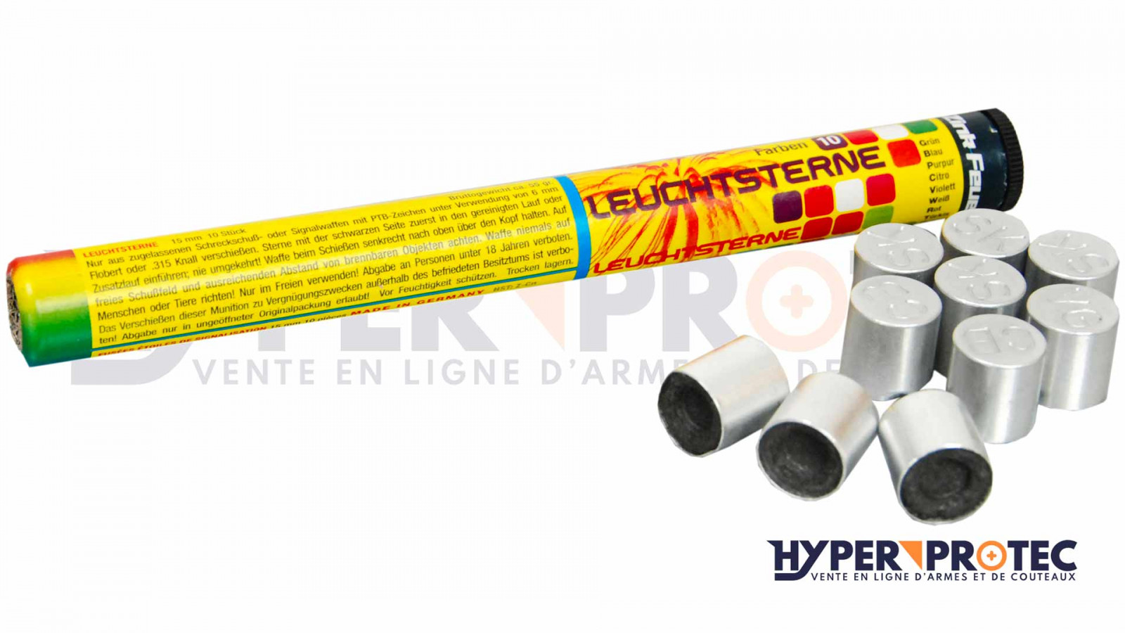Tube de 10 fusées lumineuses de 15 mm pour arme d'alarme a tirer avec un embout lance fusées. Compatibilité avec l'embout lance-fusée des armes d'alarme de calibre 8mm ou 9mm (cal .315), ou 6mm. Pour tirer une fusée, vous devez utiliser une cartouche à blanc qui va servir de propulseur, durée du signal environ 8 secondes.