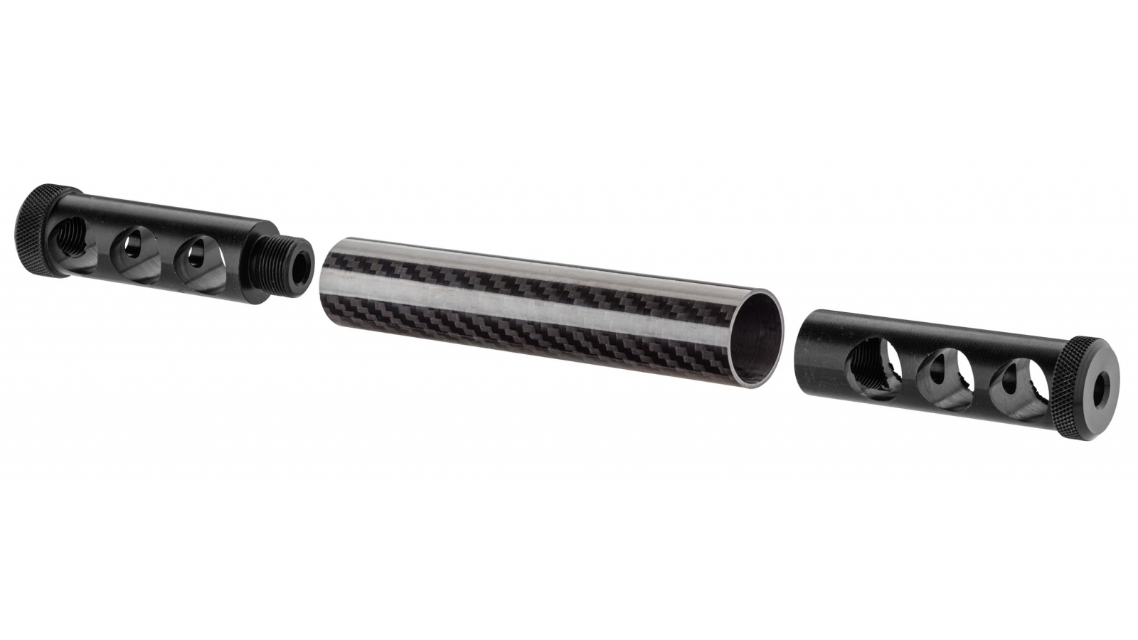 Gamme de modérateur de son en fibre de carbone entrelacé, ultra léger et très résistant, la finition de ce silencieux pour arme est parfaite et le résultat est bluffant. La fibre de carbone croisée du silencieux 22LR offre des reflets agréable à l'oeil de par la juxtaposition des couches.