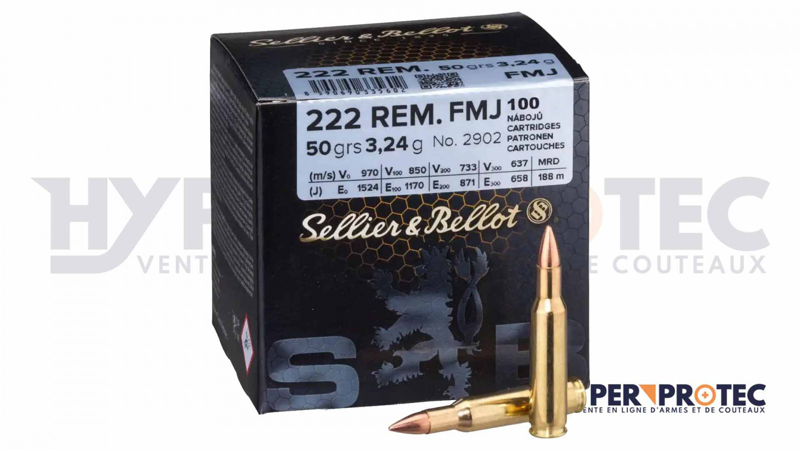 Boîte de 50 ou 100 cartouches 222 Remington au choix. Munition calibre 222 Remington de marque Sellier & Bellot, type ogive FMJ, Full metal Jacket.