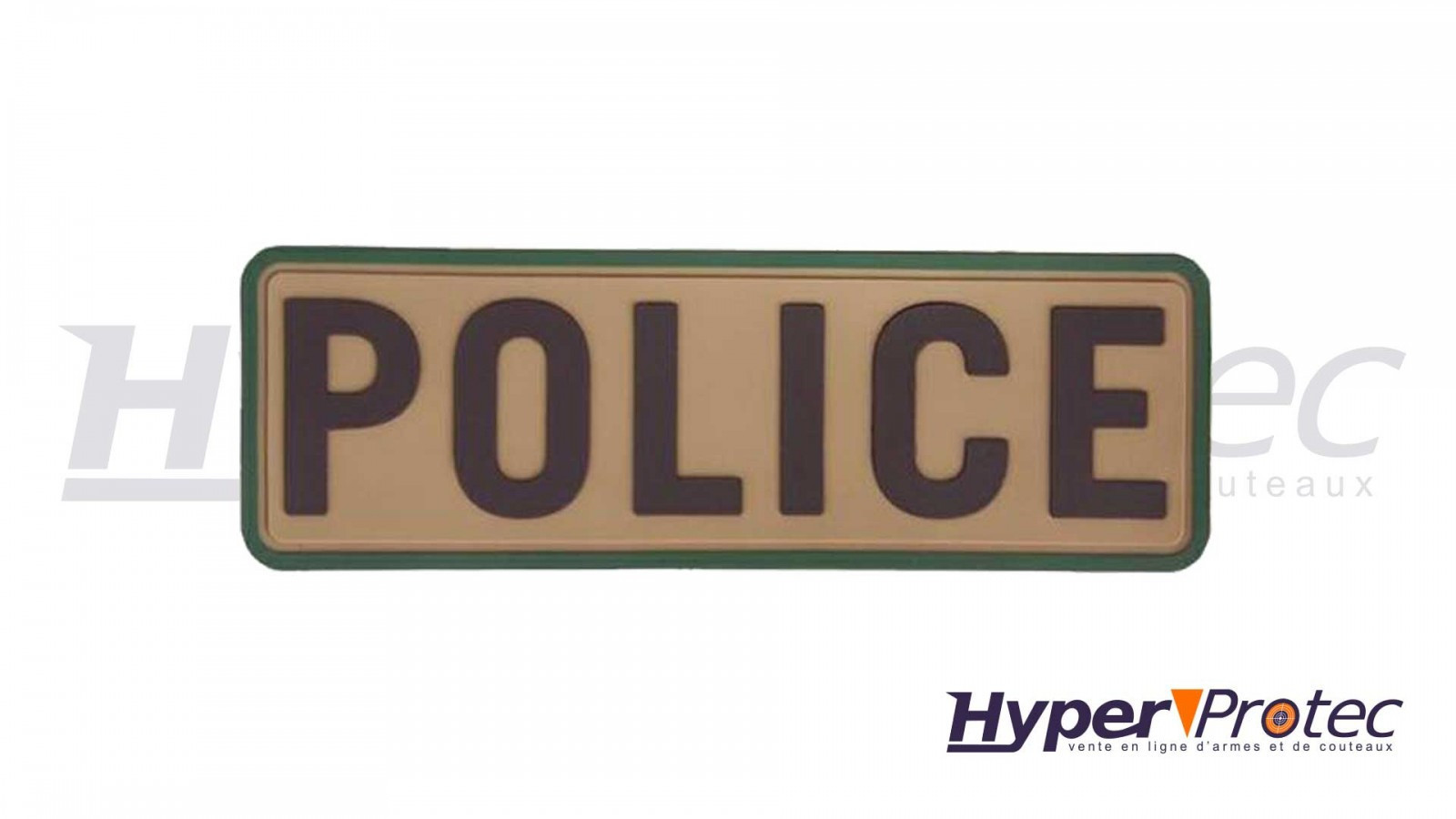Ecusson en pvc avec le texte POLICE pour scratché sur votre textile ou fourreau de carabine. Patch Police de coloris tan et de petite dimension de 15 x5 cm.