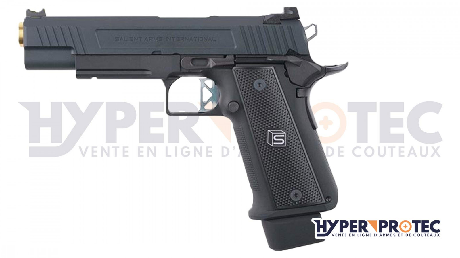 Fabriqué avec le plus grand soin, la gamme EMG SAI DS 2011 est en aluminium CNC et embarque tout les trademarks des pistolets de compétition Salient Arms : canon style nitride de titane, organes de visée compétition à fibres optiques, sécurité ambidextre et biensur tout les marquages Salient Arms International. Utilisant le système de chargeur Marui Hi-capa à gaz, les pistolet EMG Salient Arms DS peuvent être upgradés grâce à une gamme de pièces énorme, et la disponibilité de pièces détachées est très importante.