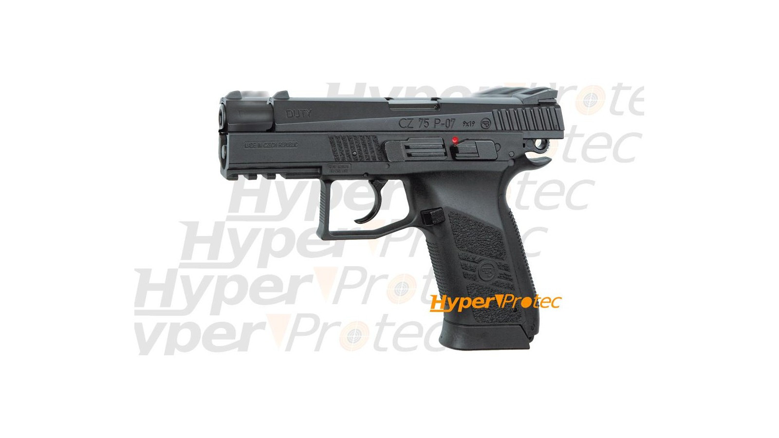 Pistolet CZ 75 duty à culasse métal et mobile en airsoft gun, tir des billes de 6 mm. Capacité du barillet 16 coups Modèle - pistolet airsoft - propulsion par capsule de CO2, chargement de la capsule de CO2 dans la crosse - cran de sécurité - simple act