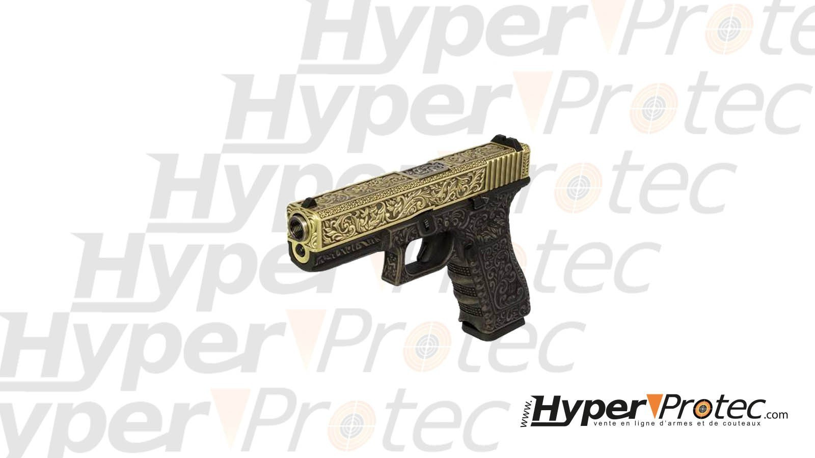 Une réplique du glock 23 par WE avec une finition bronze floral pattern, en propulsion Gaz Bouteille GBB.