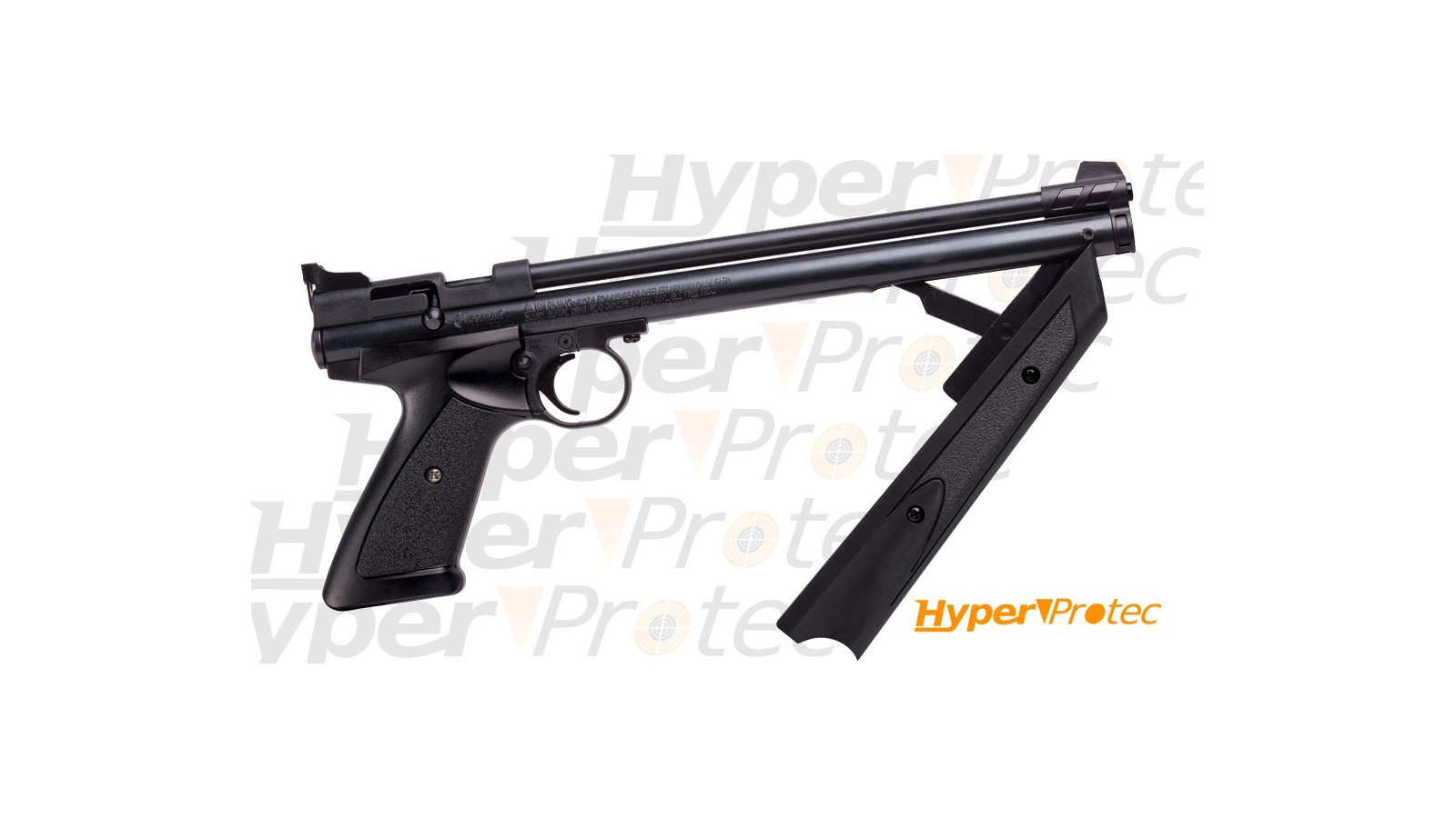 Pistolet à plombs élégant au design moderne, le Crosman 1377 American Classic figure ici dans une version toute noire en calibre 4.5mm. Facile à utiliser et disposant d'un canon long pour un tir précis, il est apprécié par les tireurs de loisir qui affectionnent son verrou par levier latéral. De plus, l'armement se fait facilement en actionnant une pompe qui se trouve dans le garde-main à l'avant sous le canon rayé. la puissance de la pompe à débit variable vous permet d'ajuster la puissance au réarmement selon la distance de tir.