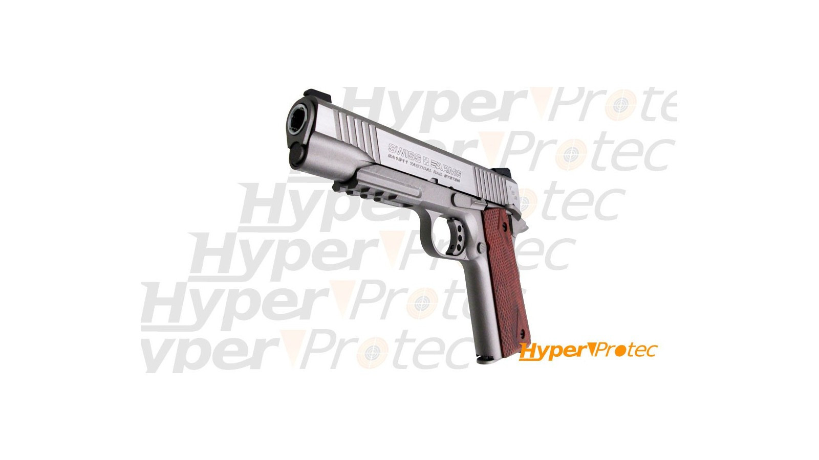 Pistolet à billes d'acier CO2 réplique de l'emblématique Colt 1911 produit par Swiss Arms ici en version billes d'acier, ce SA1911 TRS tactical dispose d'une belle finition avec une culasse mobile au tir à effet de recul dont les faces planes sont polies gris chromé. La réplique est tactique est dispose d'un rail inférieur picatinny pour les accessoires.