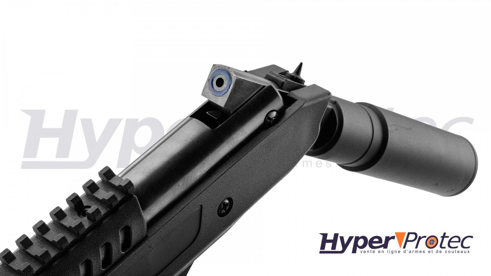 Un rail Picatinny entourant le cylindre de cette arme à plomb permet l'installation d'une optique de type point rouge, favorisant une acquisition rapide de la cible.