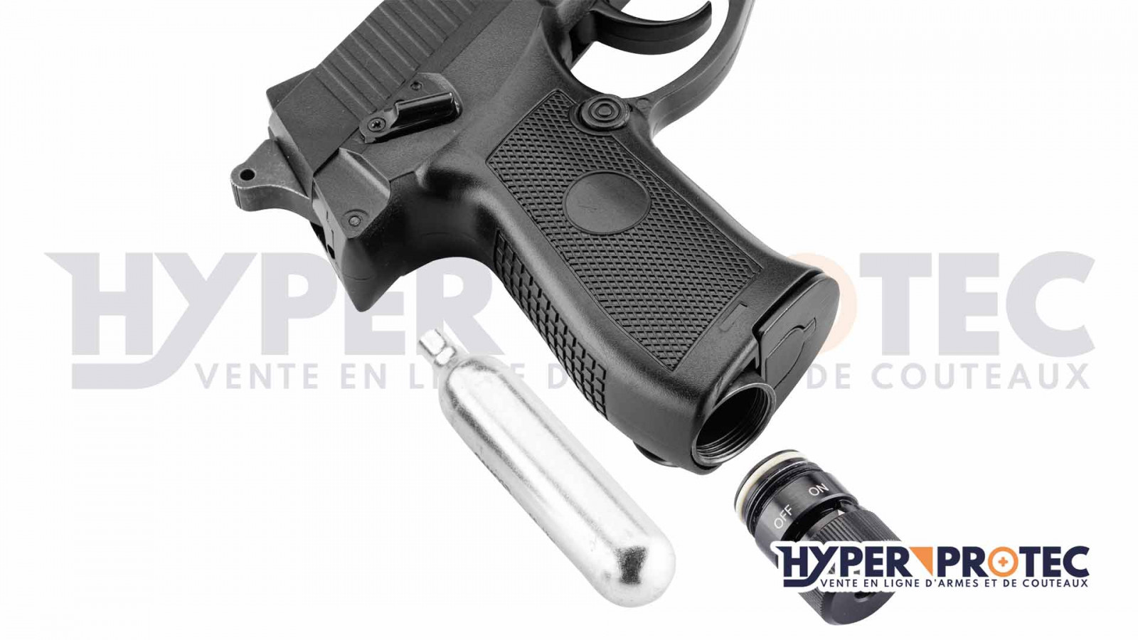 Son fonctionnement semi-automatique et son réservoir de CO2 percutable pour une mise en service immédiate en font une arme de défense toujours prête et à grande capacité grâce à son chargeur de 7 coups !
