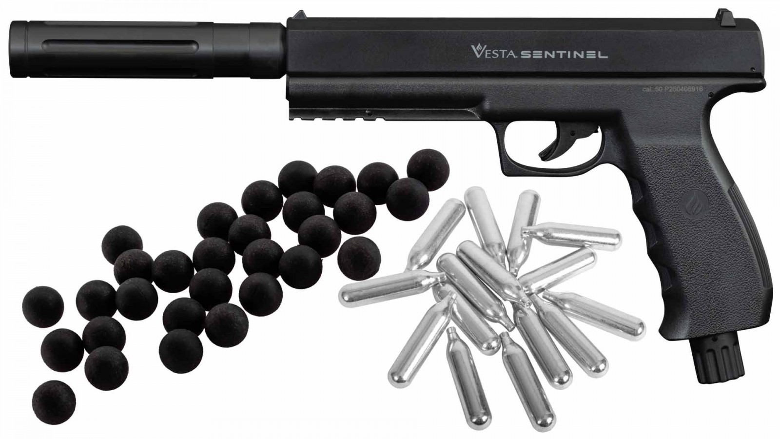Un nouveau venu sur le marché du home défense, avec ce pistolet Vesta SENTINEL avec Extension de canon Tachyon-S, qui développe 19 joules de puissance pour la propulsion de balles caoutchouc. Il vous sera livré en pack complet avec 100 balles caoutchouc Rubberball, 10 capsules de CO2.