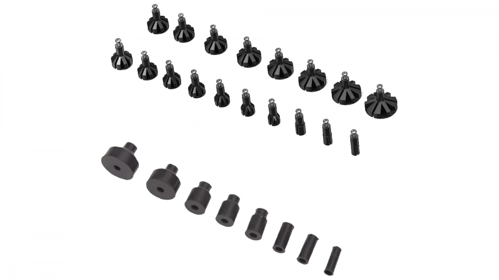 Kit professionnel de visée laser pour l'alignement et le calibrage des canons. Compatible avec les calibres de 4,5mm à 20mm grâce à ses 26 adaptateurs inclus (18 en plastique et 8 en caoutchouc).