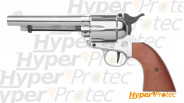 Véritable revolver d'alarme en métal et bois en calibre 9 mm à blanc en vente libre. Revolver à blanc 1873 Bruni qui ne fait qu'une détonation et de la fumée, mais ne tire pas de projectile. Arme de parade pour les rassemblements western, de coloris chromé du plus bel effet dans un ceinturon à poche et alvéoles genre cowboy.