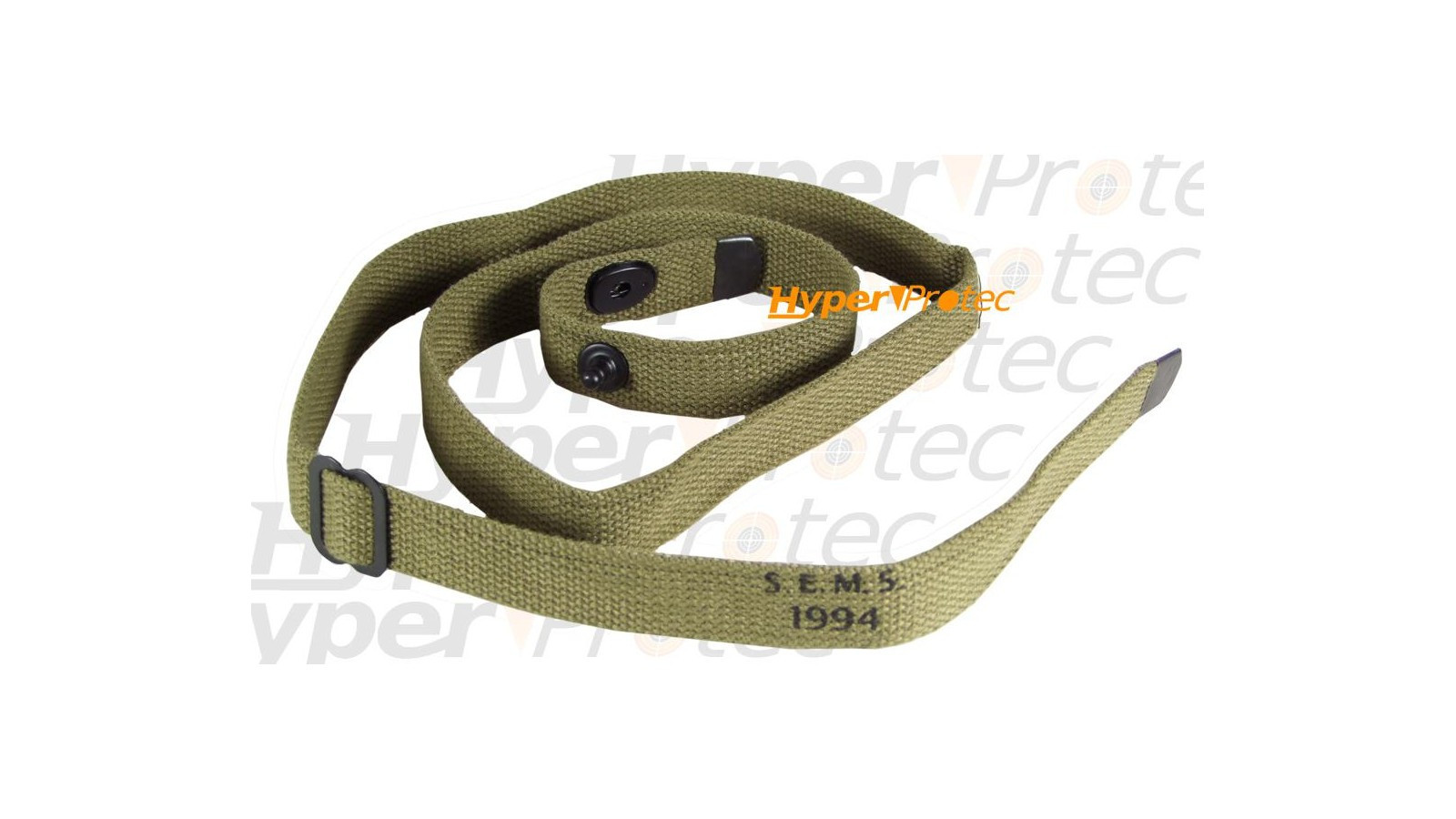 Bretelle de carabine USM1 de la guerre mondiale. Sangle pour arme de collection en réplique ou véritable USM1. Bretelle de fusil en tissu vert (maille épaisse et serrée), reproduction fidèle de la bretelle d'époque avec marquage SEMS, + année selon arrivage 1943 ou 1994 Couleur Verte; Longueur 57 cm;