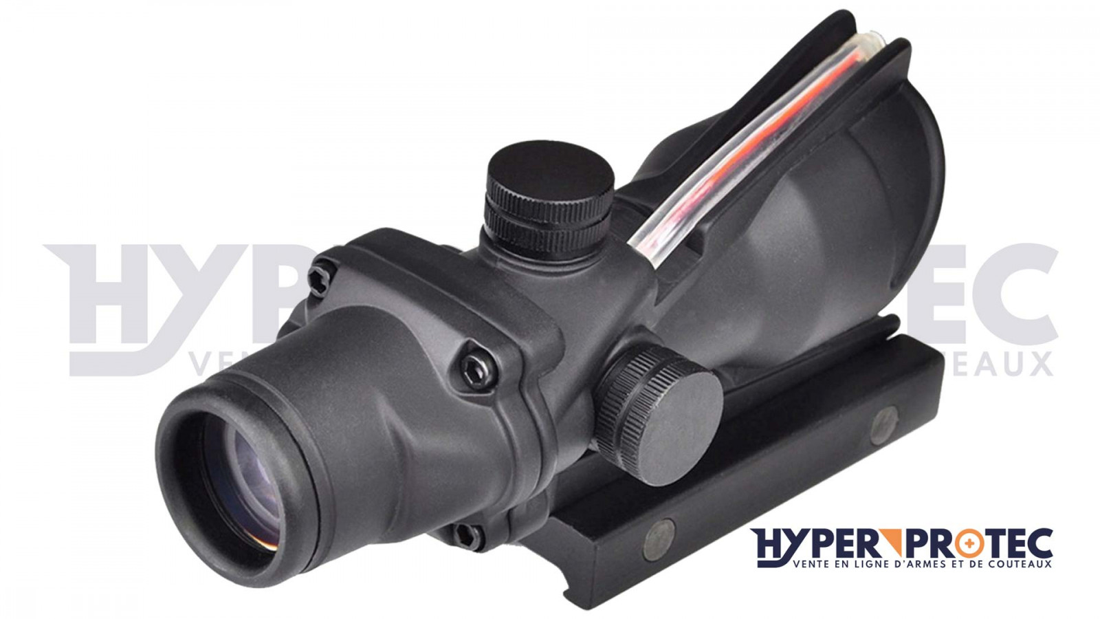 Viseur point rouge ACOG à zoom de 4x32 avec traitement anti reflet. Visée red dot à point rouge pour fusil d'assaut à balle, ou réplique à bille airsoft. Red dot tout en métal et peint en noir mat à fixer sur un rail de 22 mm à la norme picatinny. Viseur à fibre optique sans pile.
